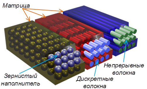 Свойства композитов определяются выбором матрицы и наполнителя, их соотношением и геометрией наполнителя.