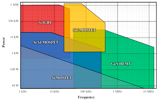 Рисунок - Частотные и мощностные режимы для различных технологий. Устройства на основе SiC и GaN работают на значительно более высоких частотах и мощностях по сравнению с устройствами на основе Si