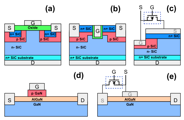 Рисунок - Схематическое изображение различных полупроводниковых структур, используемых в коммерческих силовых SiC и GaN-транзисторах. (a) SiC вертикальный планарный МОП-транзистор с обеднением затвора. (b) SiC вертикальный двухканальный МОП-транзистор. (c) SiC вертикальный каскодный JFET. (d) GaN p-GaN HEMT-транзистор с затвором. (e) GaN каскодный HEMT.