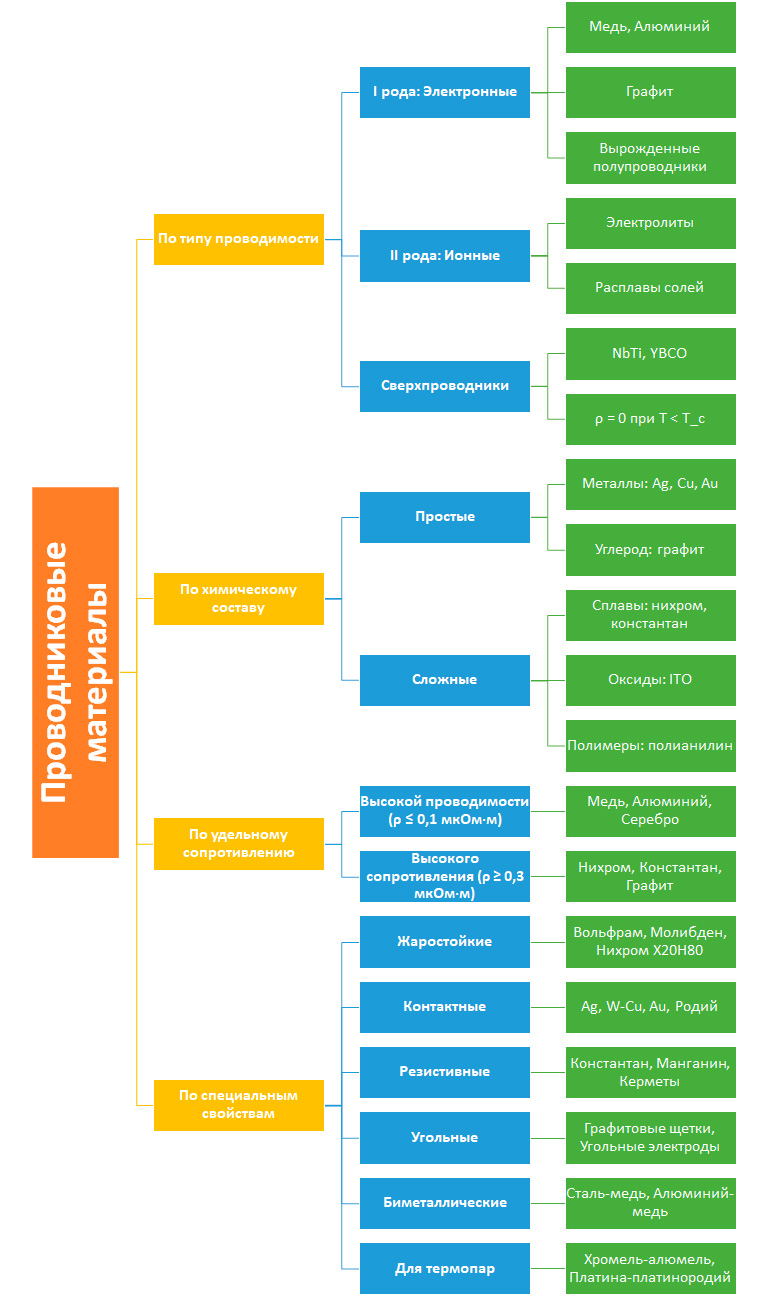 | Сложные | Сплавы и соединения | Нихром, Константан, ITO, Проводящие полимеры | |